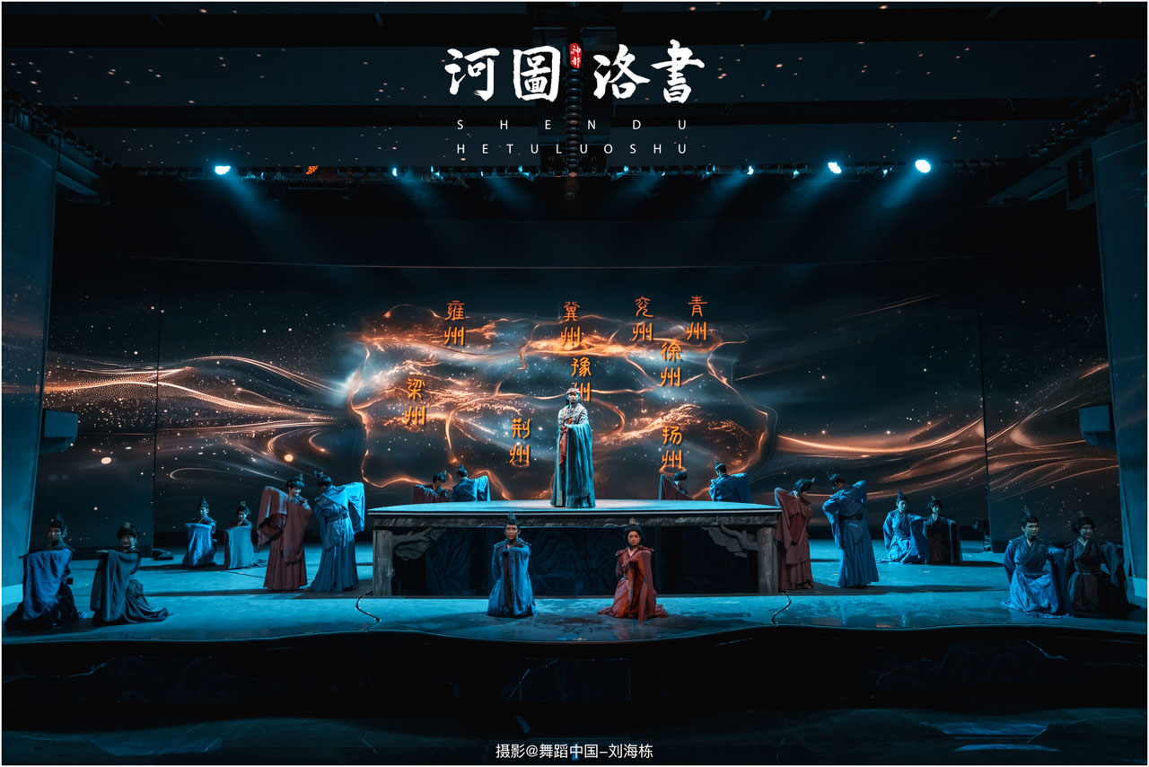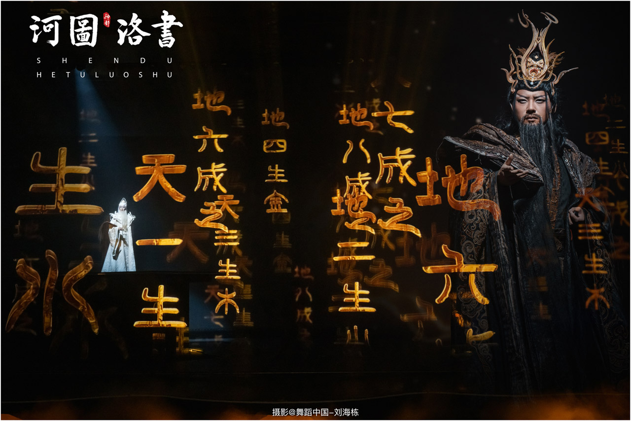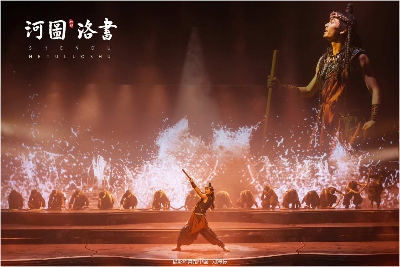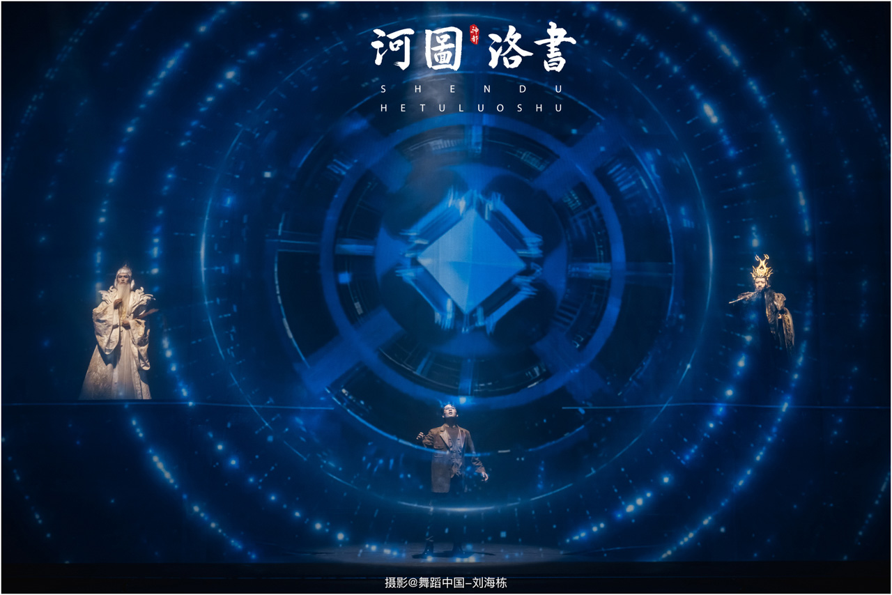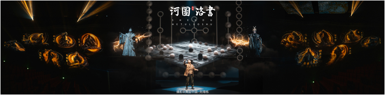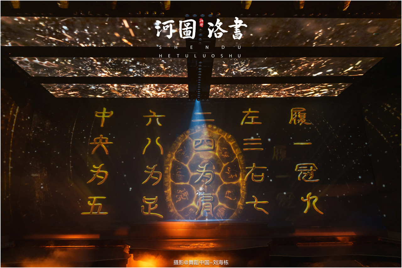 2.洛书现世:大禹治水时神龟背负的洛书纹样,与现代舞台LED屏显的数字矩阵形成科技与传统的互释;