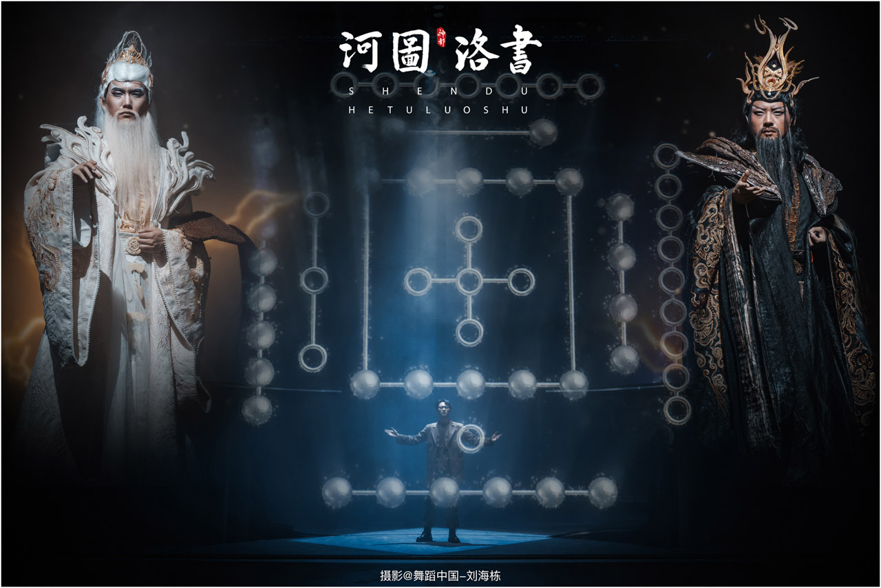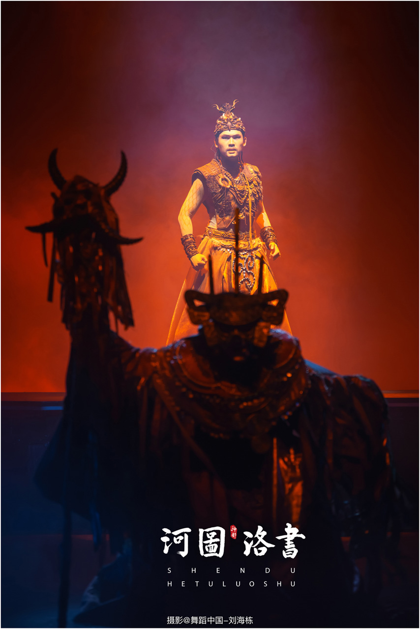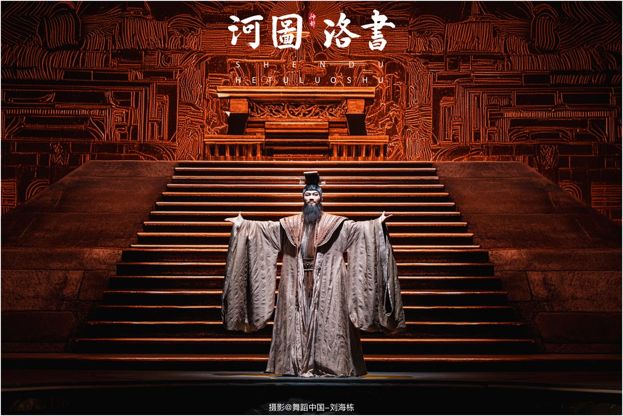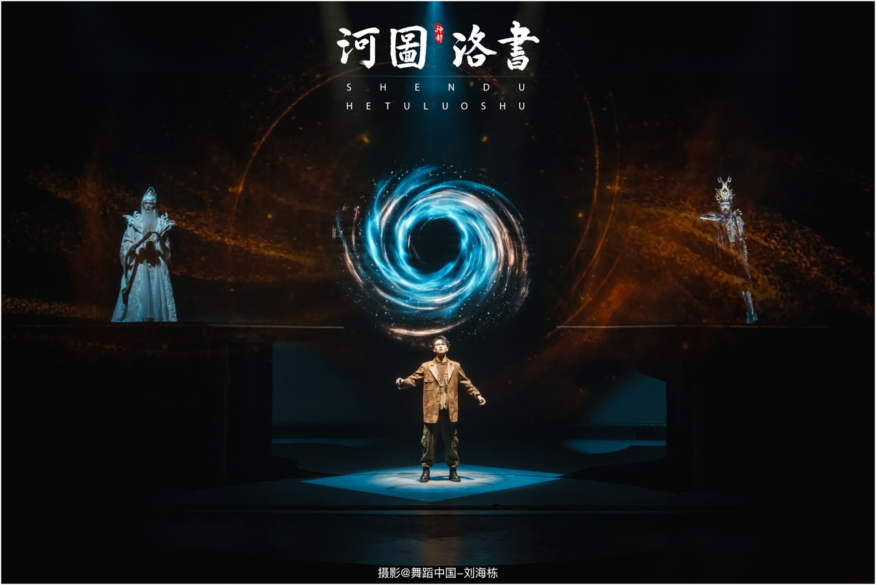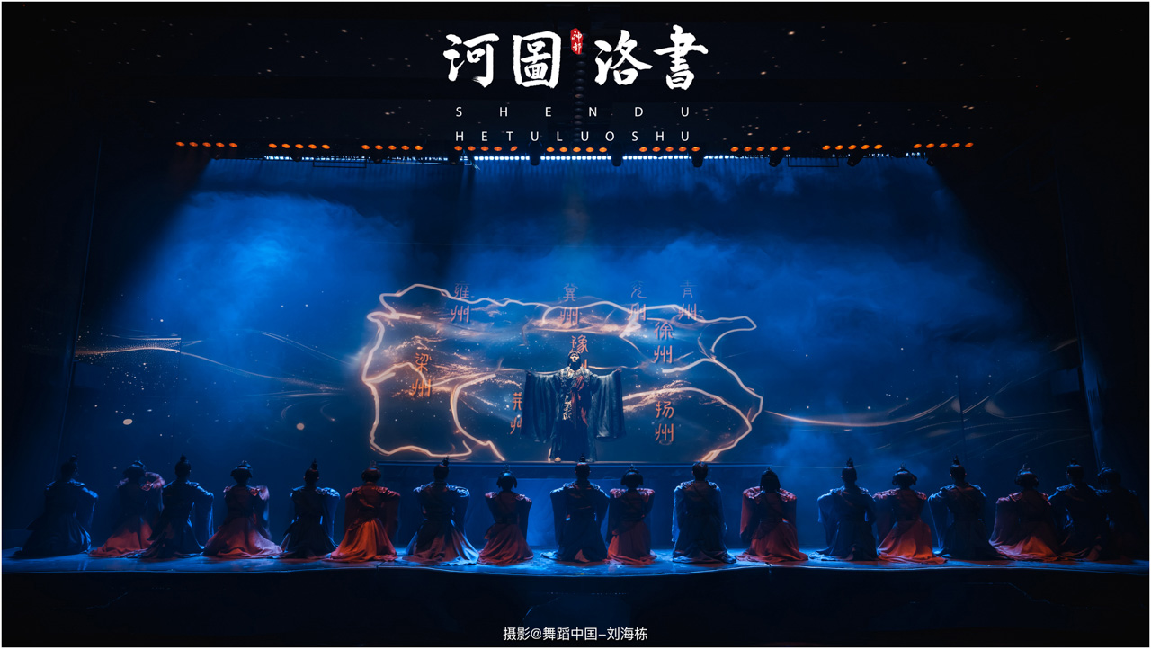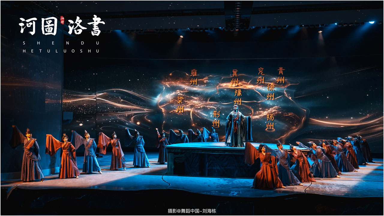 2.洛书现世:大禹治水时神龟背负的洛书纹样,与现代舞台LED屏显的数字矩阵形成科技与传统的互释;