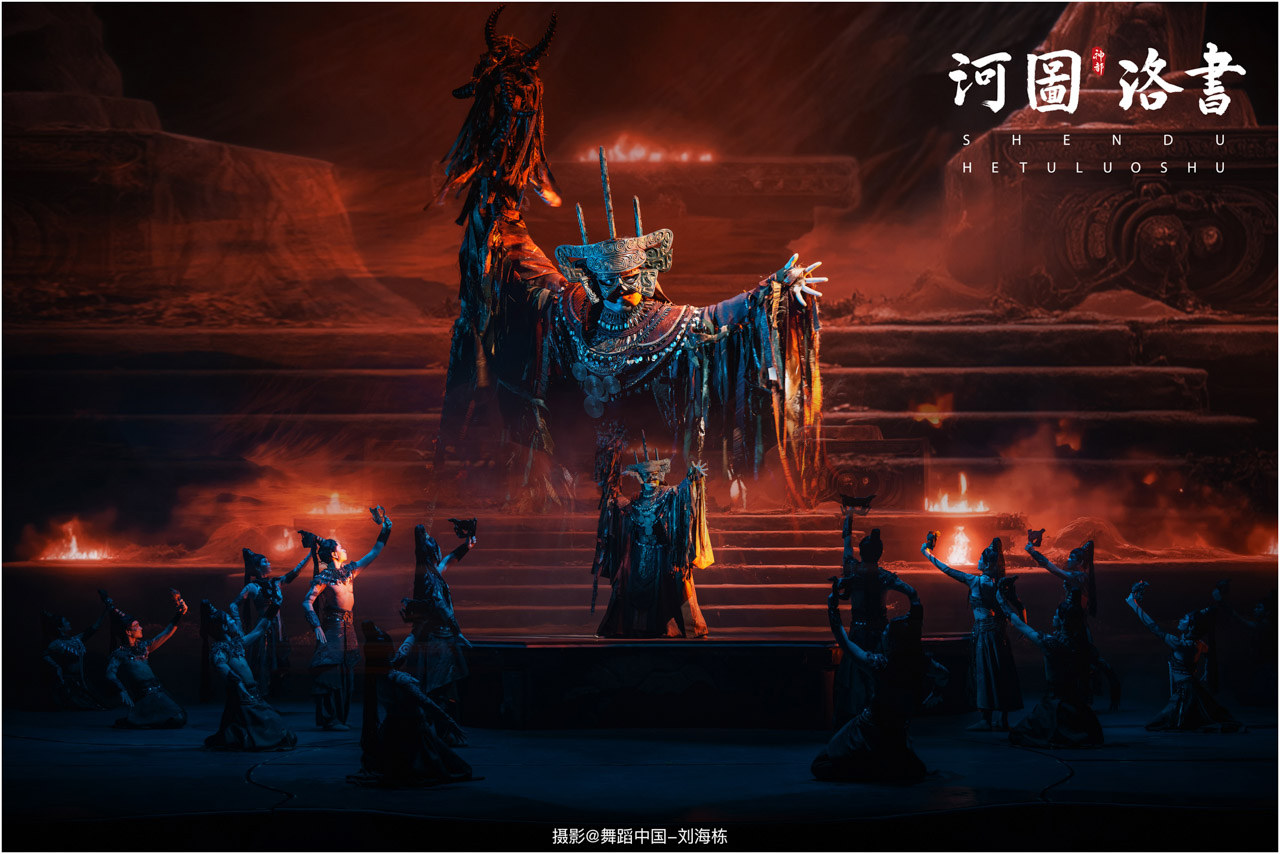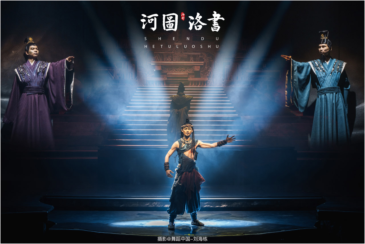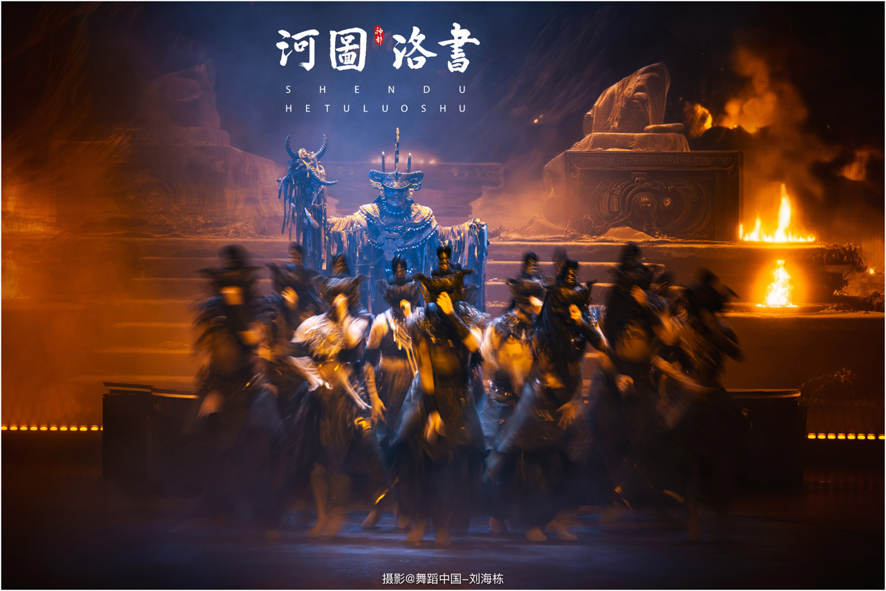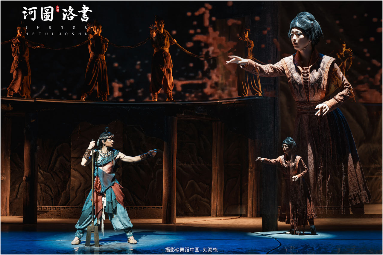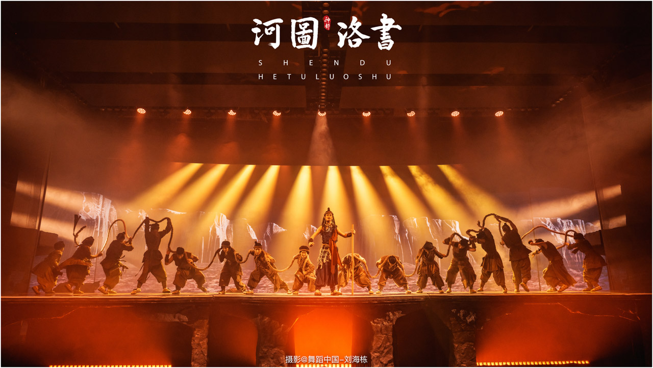 2.洛书现世:大禹治水时神龟背负的洛书纹样,与现代舞台LED屏显的数字矩阵形成科技与传统的互释;