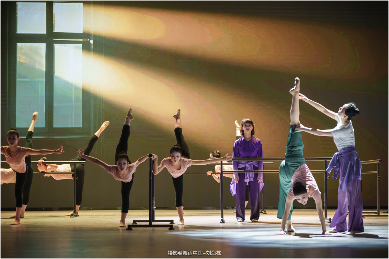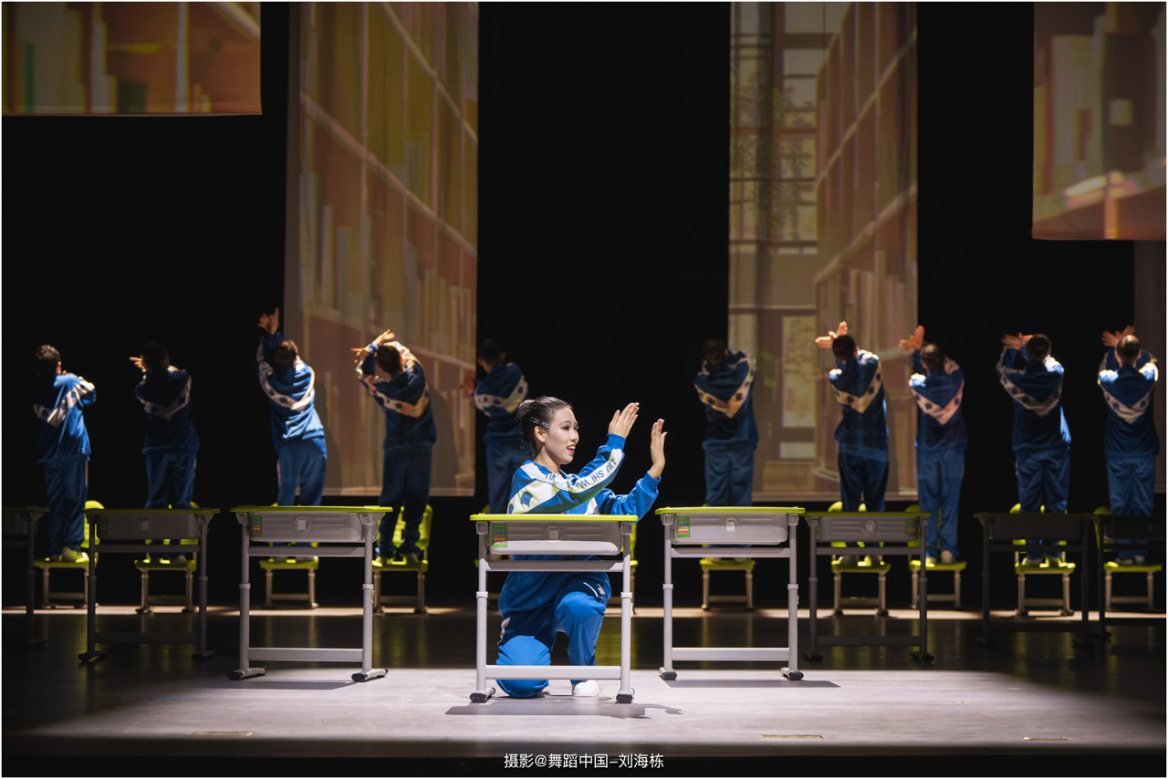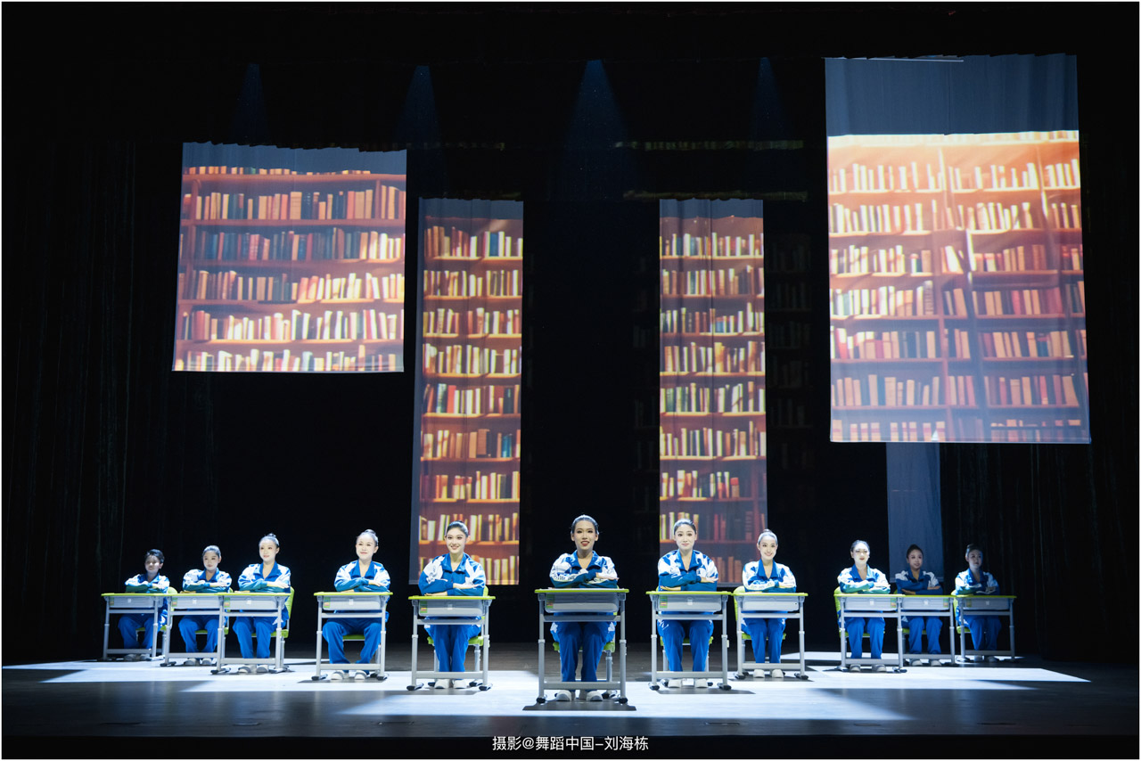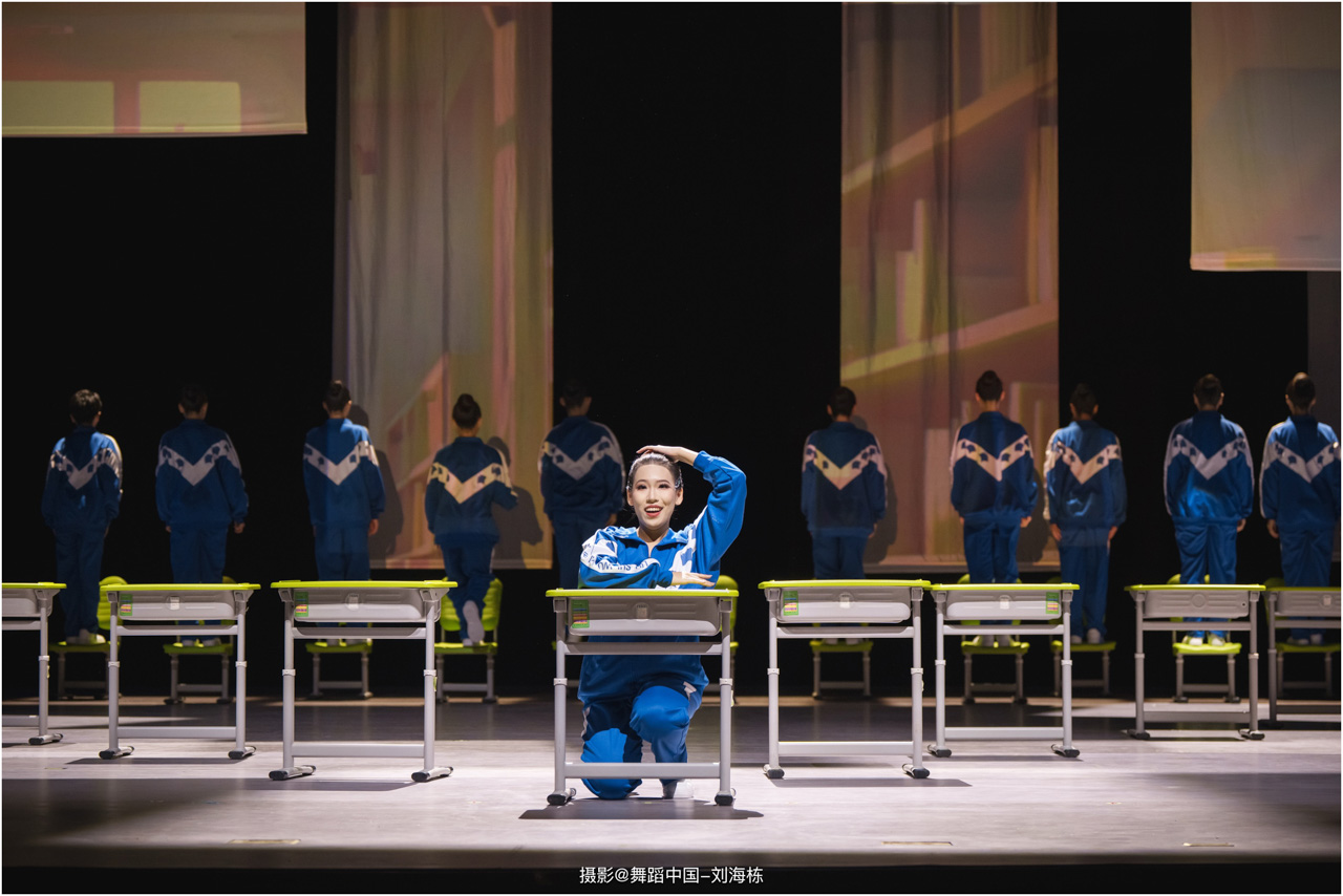 “初心·足迹”一幕中,六根把杆变换出熟悉的练功场景,灯光流转间,一代代舞者的成长故事缓缓铺展。基本功展示、民间舞与古典舞舞轮番上演,更有充满青春气息的“课桌舞”,再现中学生在教室与练功厅里的成长日常,唤醒全场共同的校园记忆。