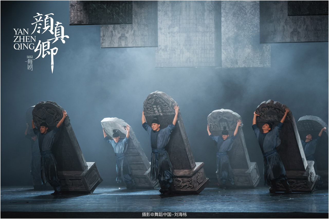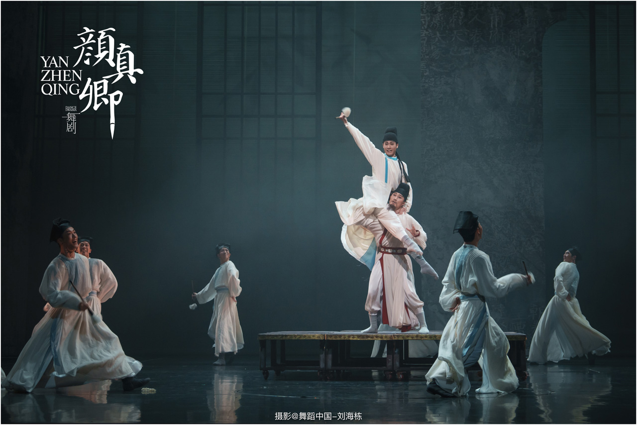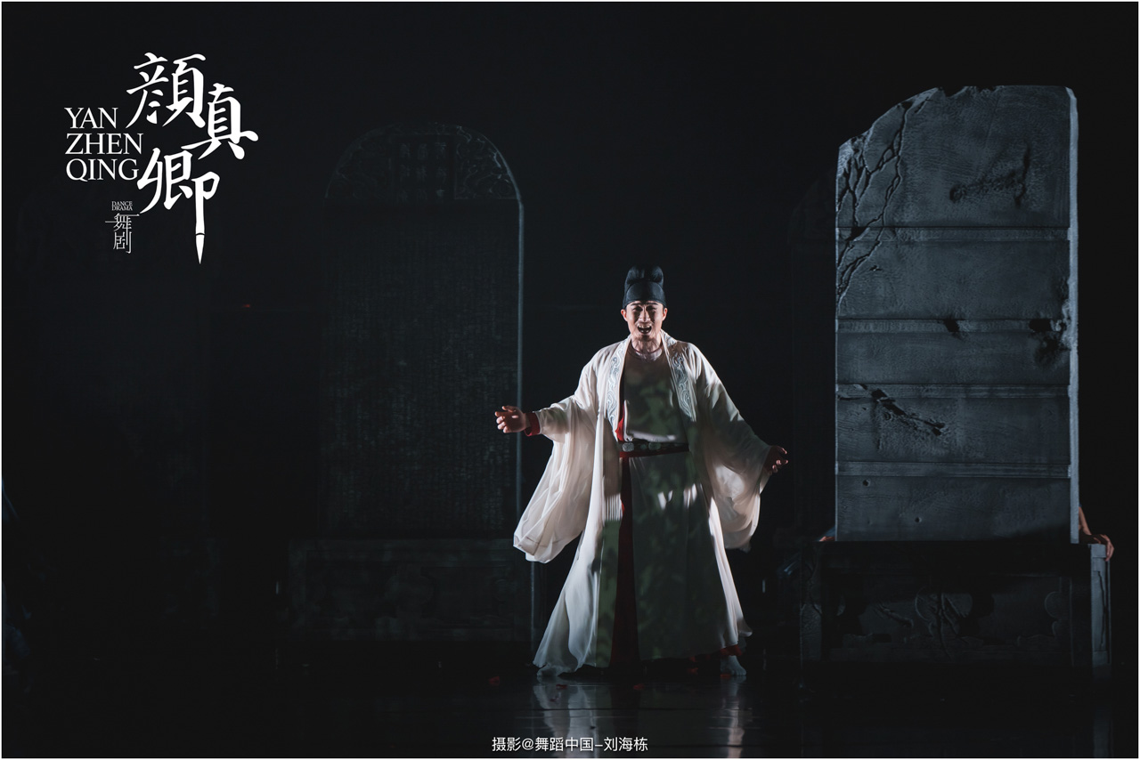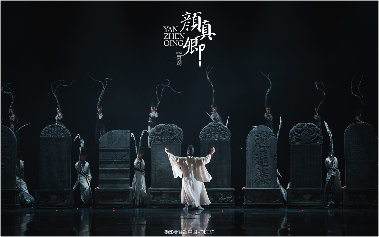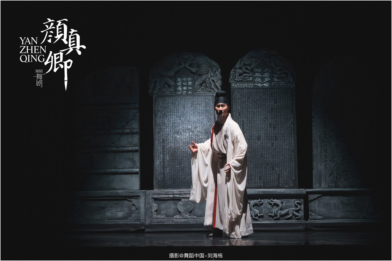 从“陋室提笔”到“碑林绝笔”,舞剧层层铺陈颜真卿的人生故事,将他“真卿”“清臣”中承载的士大夫精神立体丰满的呈现在舞台上;从克制隐忍到悲怆决堤,舞剧渐渐揭示颜真卿的情感变化,既展现祭文中“心手合一”的笔势墨韵,更体现文稿背后“锥心刻骨”的精神内核。全剧将颜氏一族的家国情怀贯穿始终,更将颜真卿的精神境界凝聚升华。