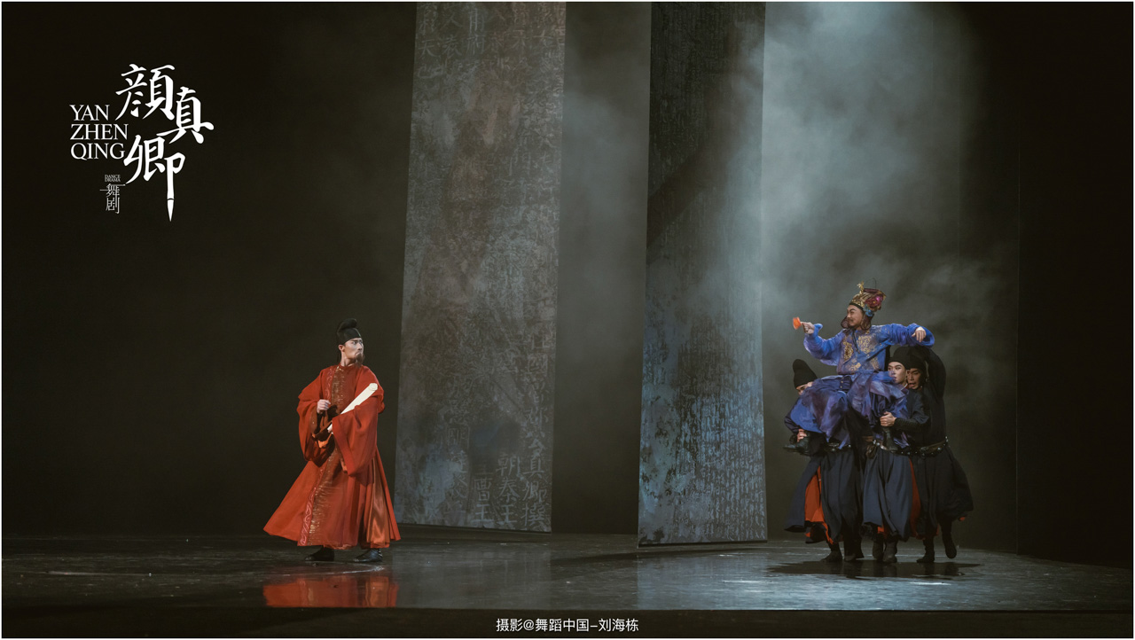 舞剧借文稿“润墨、起笔、奋笔、枯笔、墨尽”五重笔韵展开,既映照跌宕心境,亦书写激扬人生。季明有真卿的样子,真卿像季明的影子,颜真卿教导颜季明身正报国,他们在安史之乱的危难时刻挺身而出,后相继以生命成就大义。叔侄二人“堂”上承家风,“宴”间共奋起,“关”前赴国难,以一腔热血挥洒颜氏一族千古忠义。